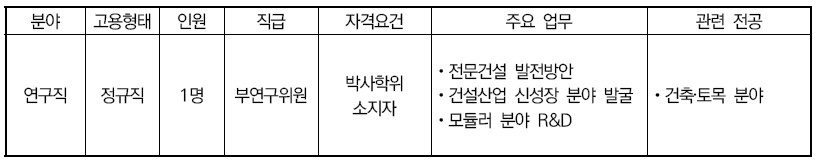 대한건설정책연구원(RICON)의 미래를 이끌어나갈 창의적이고 유능한 인재를 모집하오니, 많은 응모 바랍니다.